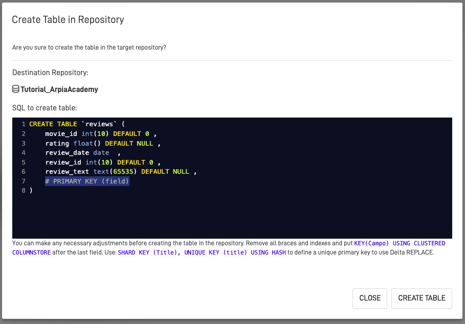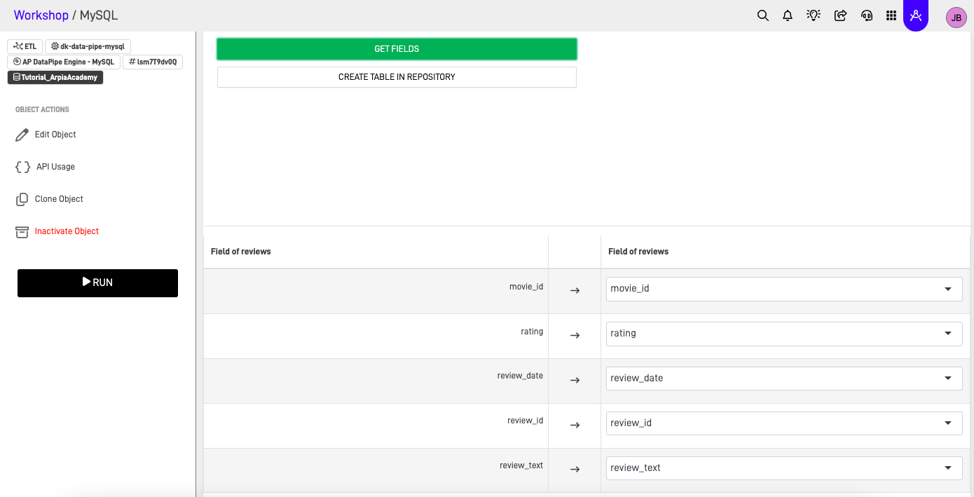 Here will be shown the SQL to create the table in our Destination Repository, its mandatory to design a primary key to be able to create the table, after we finish with this process we can hit on create table and the new table will appear in the options of our destionation repository. After we select it the fields mapping wll appear under and we can clck on get fields to automatically map the fields.