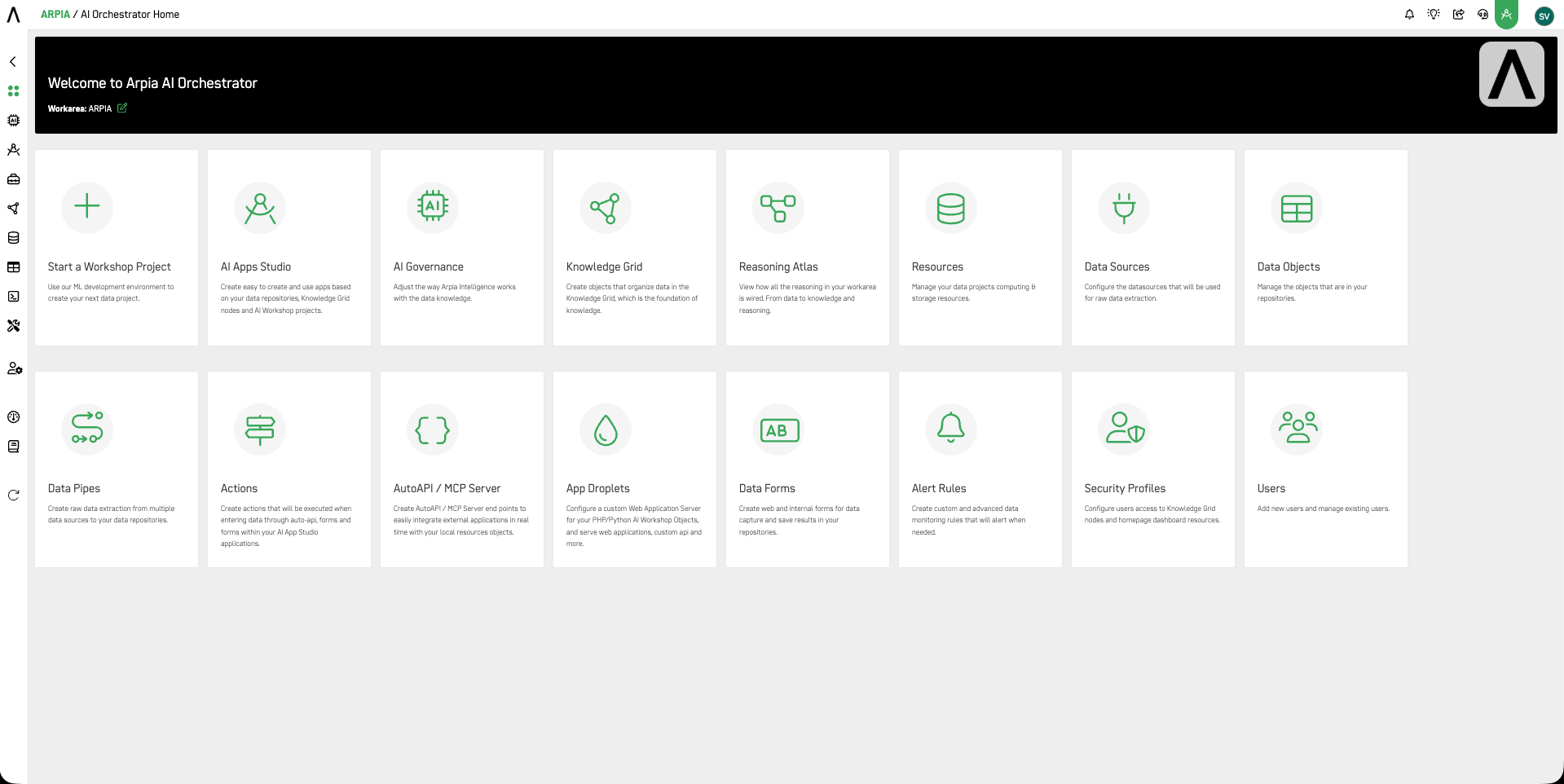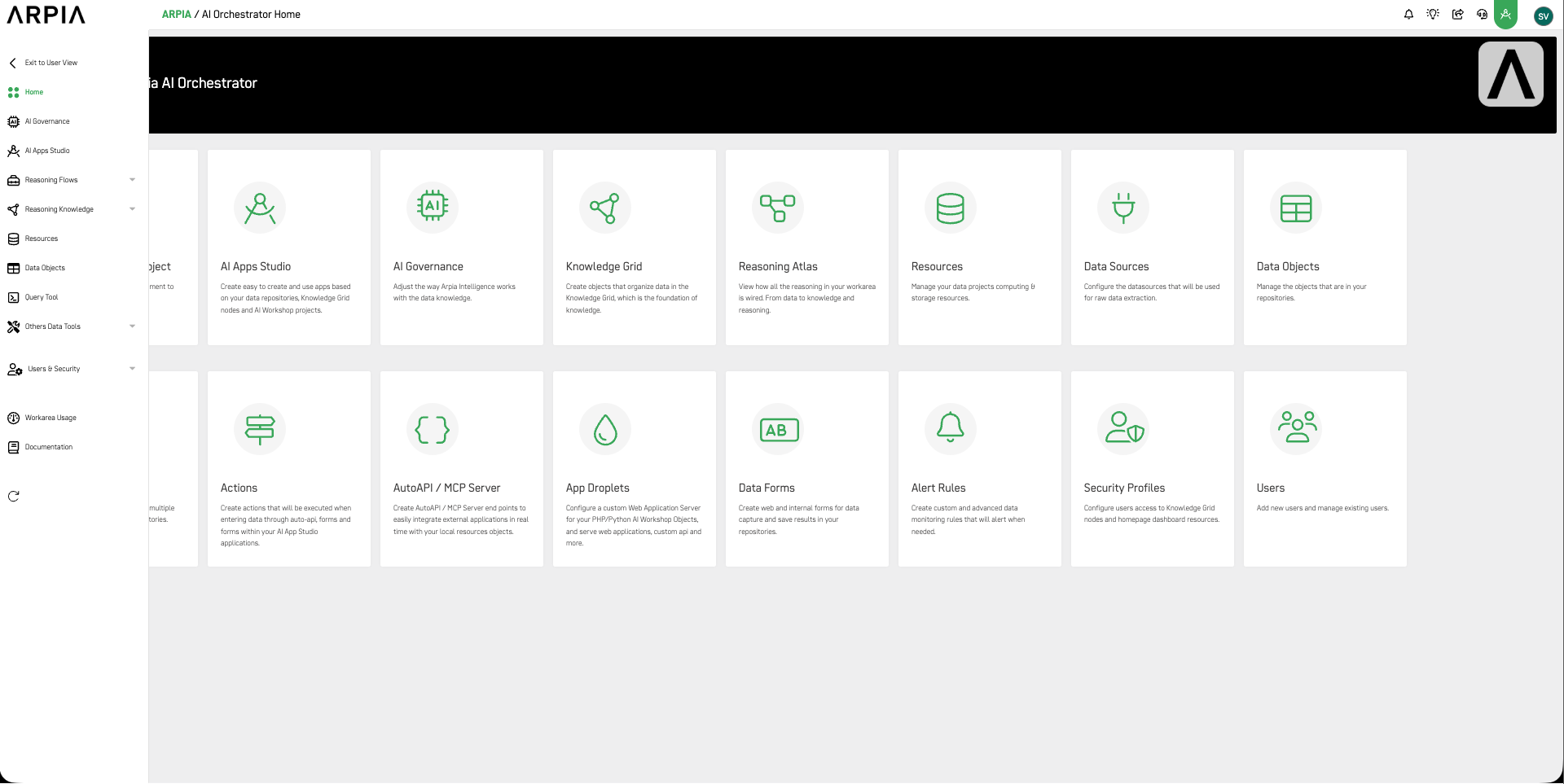 AI Orchestrator is the main control center of the ARPIA platform. It gives you one place to manage everything from your data and AI apps to security rules and resources. With Orchestrator, you can organize information, build and launch AI apps, connect them to other tools, and set up alerts or permissions. It also helps you keep resources efficient and secure. Think of it as the “all-in-one dashboard” that brings data, AI, and governance together so everything runs smoothly.